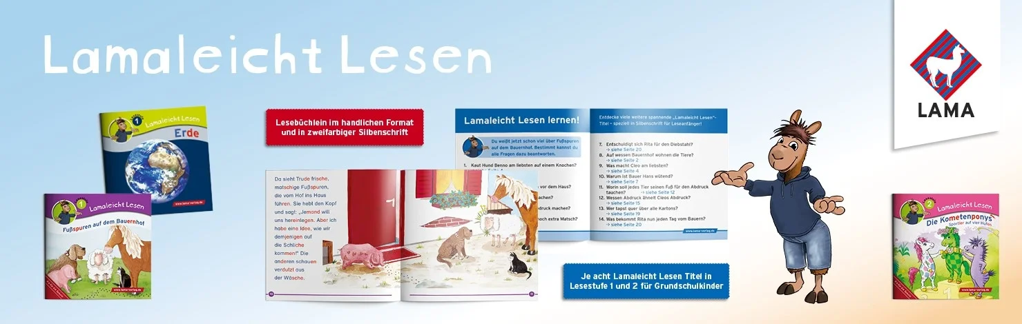 Ab jetzt machen sich LAMA Lenni und Benny Blu im LAMA Verlag für mehr Wissen für Kinder im Vorschul- und Grundschulalter stark. Lenni begleitet unsere Bildungsprodukte speziell für Grundschulen und Benny Blu vermittelt in vielen tollen Wissenstiteln motivierend Allgemeinwissen. Entdecken Sie auch unser Lernmaterial für Zuhause. Damit macht Lernen richtig Spaß!