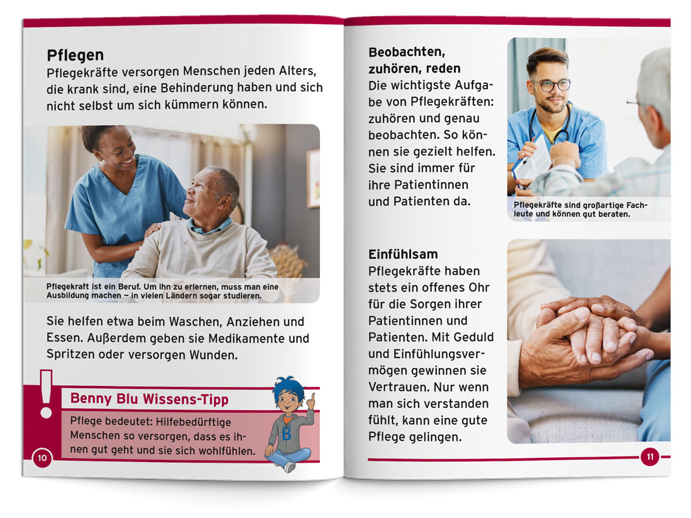 Benny Blu nimmt dich mit auf eine spannende Entdeckungsreise in die Welt der Pflege. Wieso brauchen Menschen manchmal Pflege? Welche Aufgaben hat eine Pflegekraft? Und was bedeutet eigentlich Demenz? Mit Wissensfragen, einfühlsamen Erklärungen und Benny Blu Aktions-Tipp „Erinnerungsbuch“.