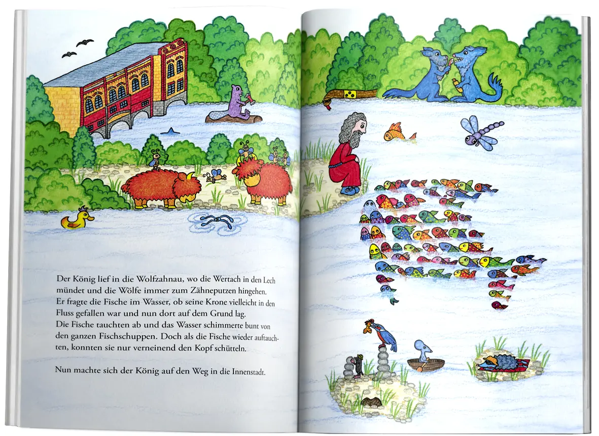 Wie aus dem Nichts taucht eines Tages ein geheimnisvoller Mann in der alten Stadt Augsburg auf. Er trägt eine herrliche Krone auf dem Kopf, und bald nennen ihn alle nur noch den König von Augsburg. Doch eines Tages ist die Krone verschwunden. Der König sucht bei den sieben Tischen, wo die Waldtiere Brotzeit machen, er sucht in der Puppenkiste und im Keller bei den bunten Bären. Nirgends eine Spur von seiner Krone. Aber Augsburg steckt voller Überraschungen …