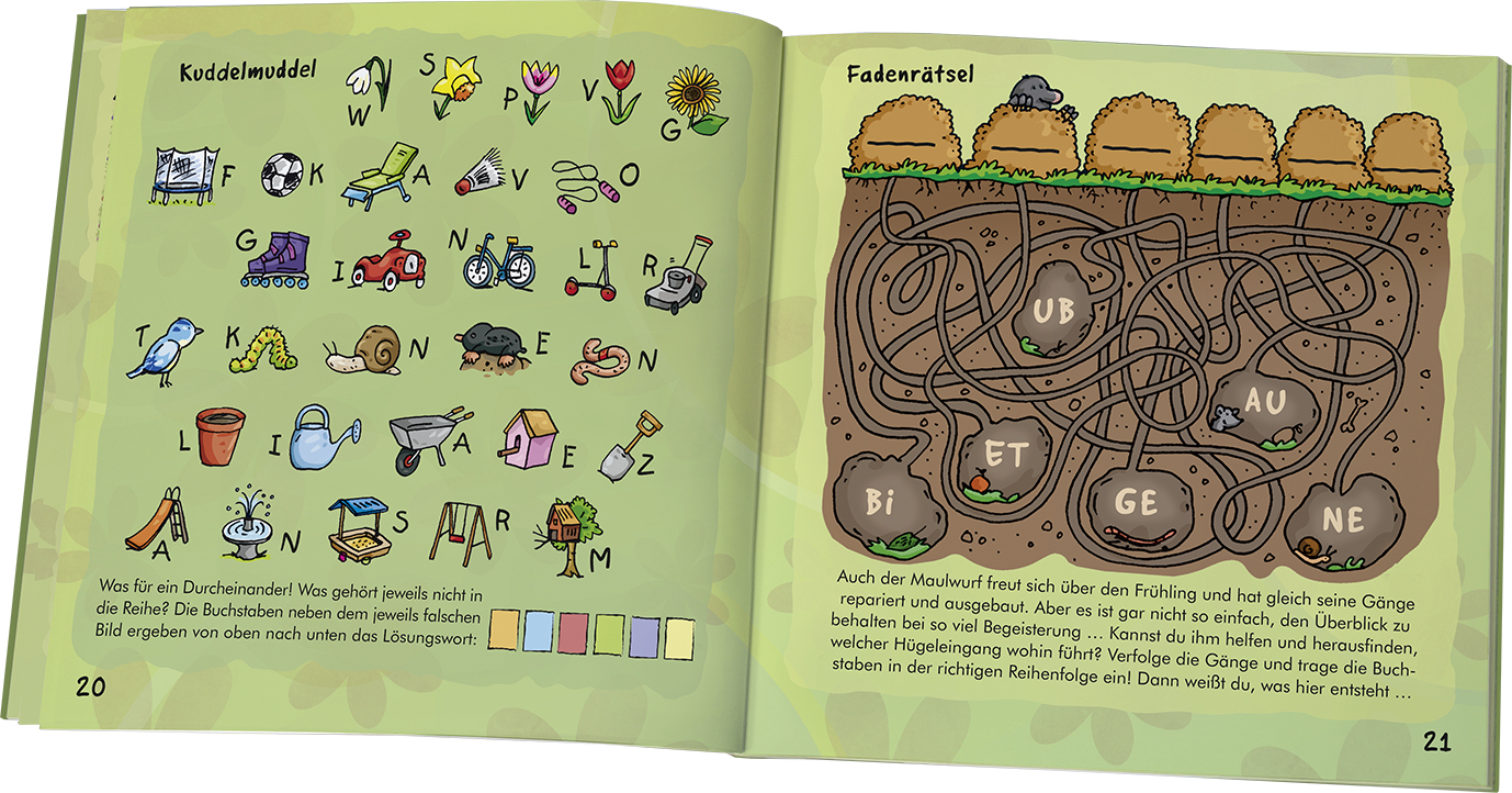 In diesem Heftchen haben die beiden fröhlich-bunte Rätsel zum Thema Frühling und Garten für dich gesammelt. Los geht's: Löse knifflige Labyrinthe, bunte Sudokus, Malen nach Zahlen, Fadenrätsel und noch viele andere Rätsel! Schaffst du sie alle?