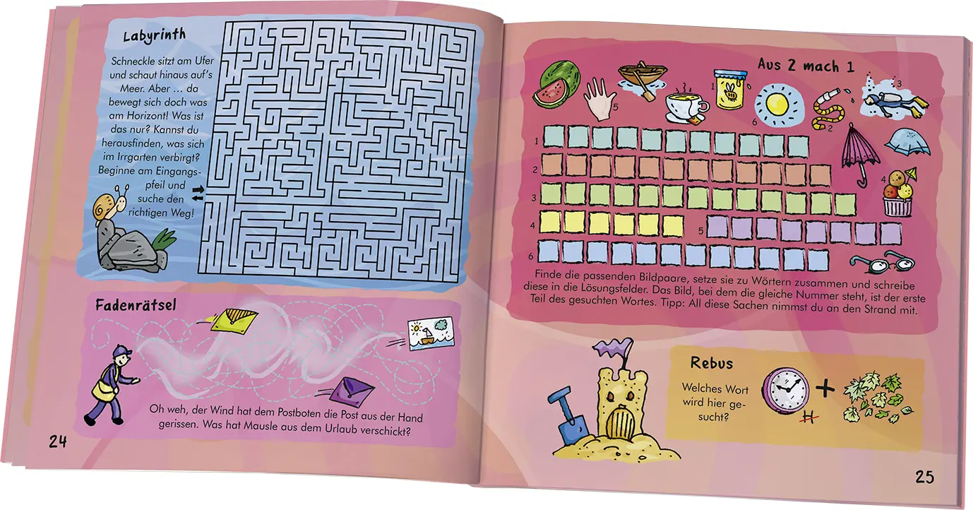 Schnapp dir deine Buntstifte und begleite Mausle und Schneckle in ihre Rätsel-Welt. Die beiden haben in diesem Heftchen fröhlich-bunte Rätsel zum Thema Sommer für dich gesammelt. Los geht's: Löse knifflige Labyrinthe, Sudokus, Fadenrätsel, Denkaufgaben und noch viele andere Rätsel! Schaffst du sie alle?