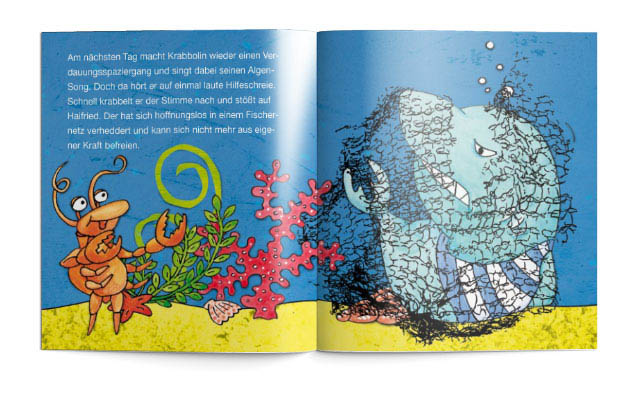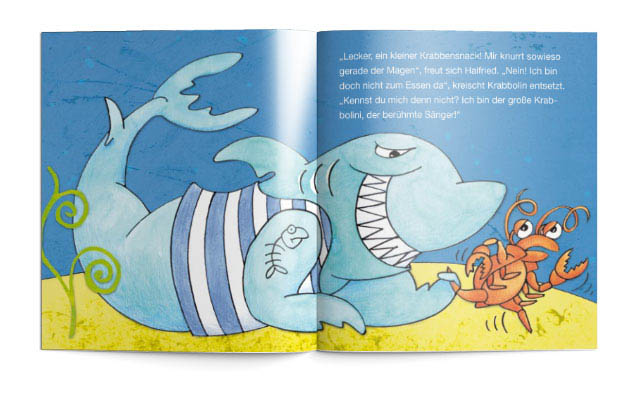 Bei der Begegnung mit einem gefährlichen Hai zeigt Krabbolini, dass auch Kleine ganz groß sein können.