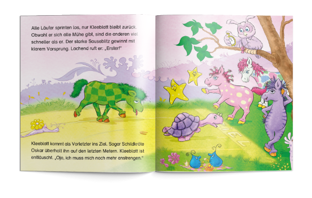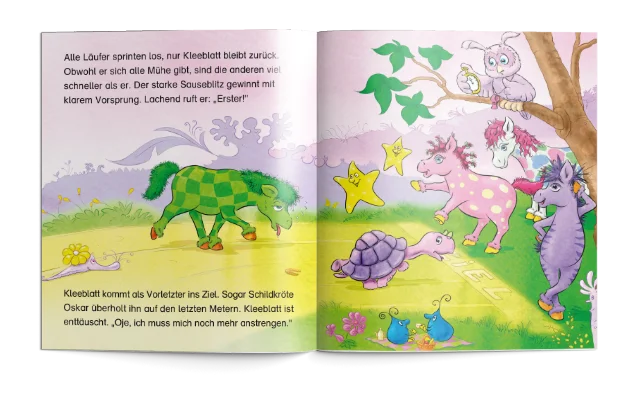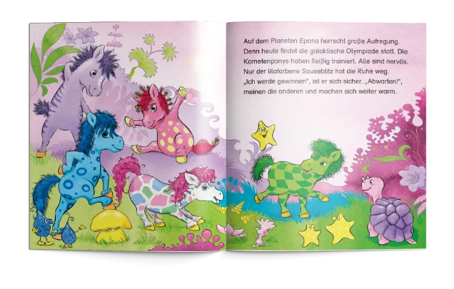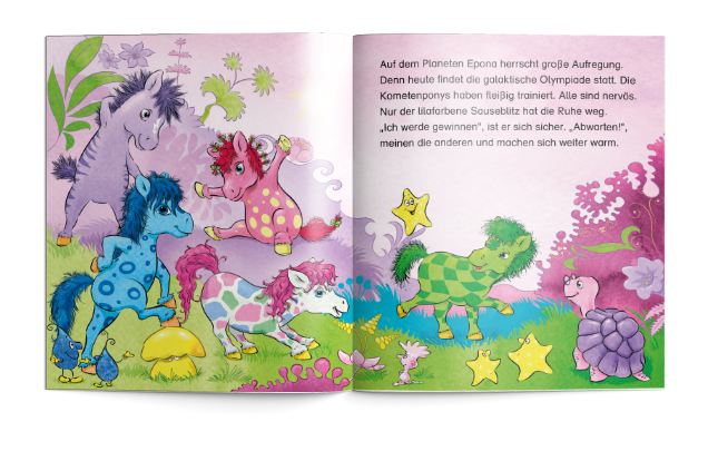 Wer der Kometenponys gewinnt wohl die galaktische Olympiade? Eines ist klar: alle haben sich gut auf den Wettbewerb vorbereitet – auch Kleeblatt. Doch kann das nicht gerade sportliche Pony den Wettkampf gewinnen?