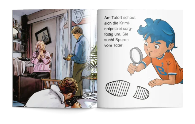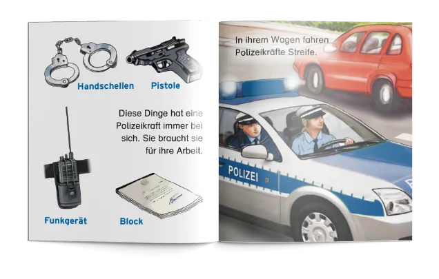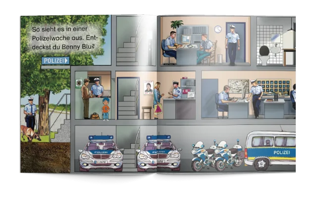 Besuche gemeinsam mit Benny Blu die Polizei. Wie arbeitet die Polizei? Wie spürt sie Verbrecher auf? Und welche Ausrüstung verwendet sie?