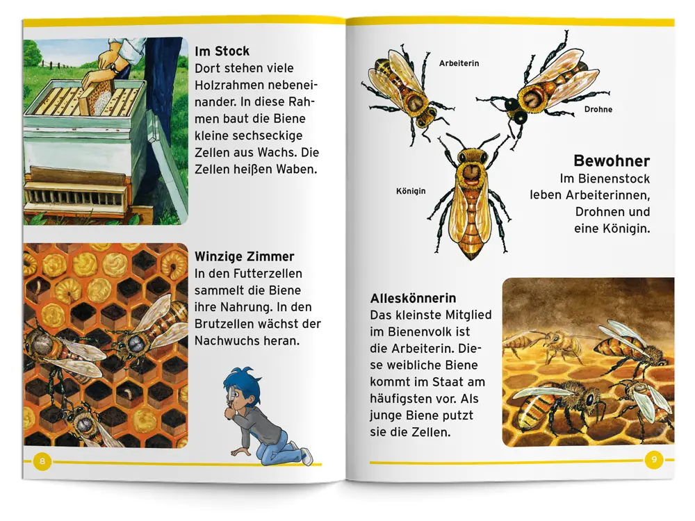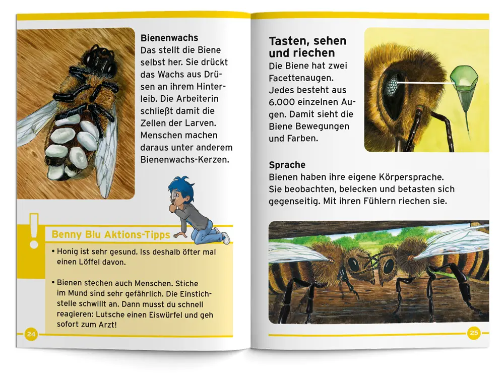 Leben im Bienenstock. Benny Blu beobachtet mit dir das Leben der Honigbiene. Wie kommt sie zur Welt? Wo wohnt sie? Warum sticht die Biene? Und wie kommt man an den Honig heran?
