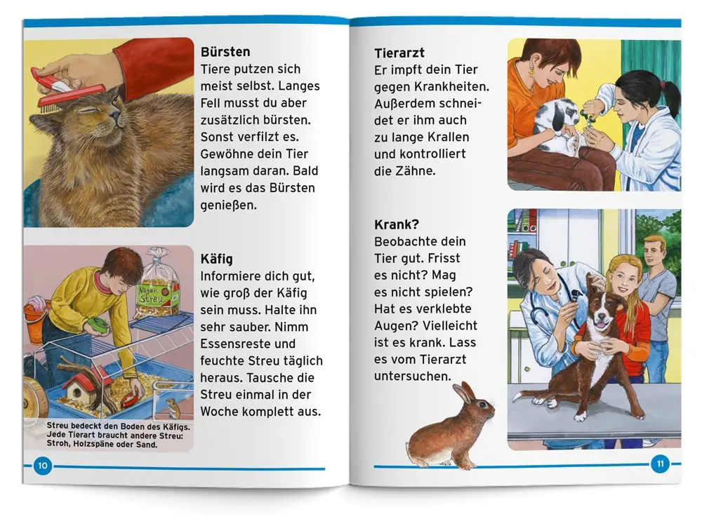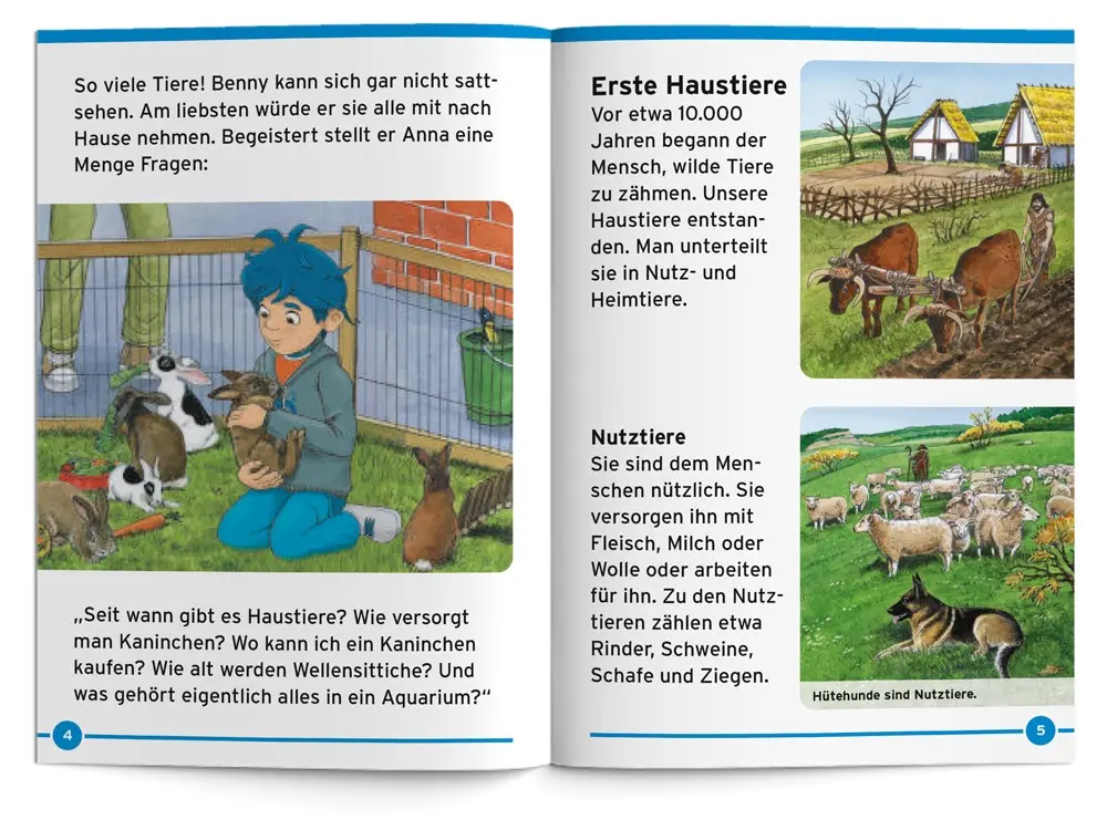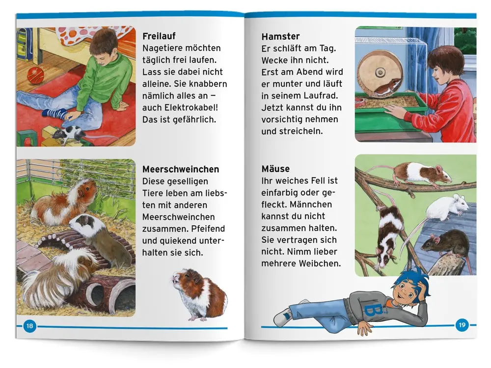 Benny Blu stellt dir viele verschiedene Haustiere vor. Woher bekommt man ein Haustier? Wie viel Auslauf braucht ein Hund? Was ist die Mauser? Und kann man Meerschweinchen einzeln in einem Käfig halten?