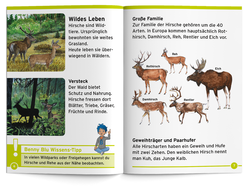 Benny Blu unternimmt einen Ausflug in den Wald. Dort lernt er viele Geweihträger kennen. Was steht auf ihrem Speiseplan? Woraus besteht ihr Geweih? Sind Rehe auch Hirsche? Und was ist eine Grünbrücke? Mit tollen Wissens-Tipps, Geweih- und Hornrätsel und Benny Blu Jägersprache.