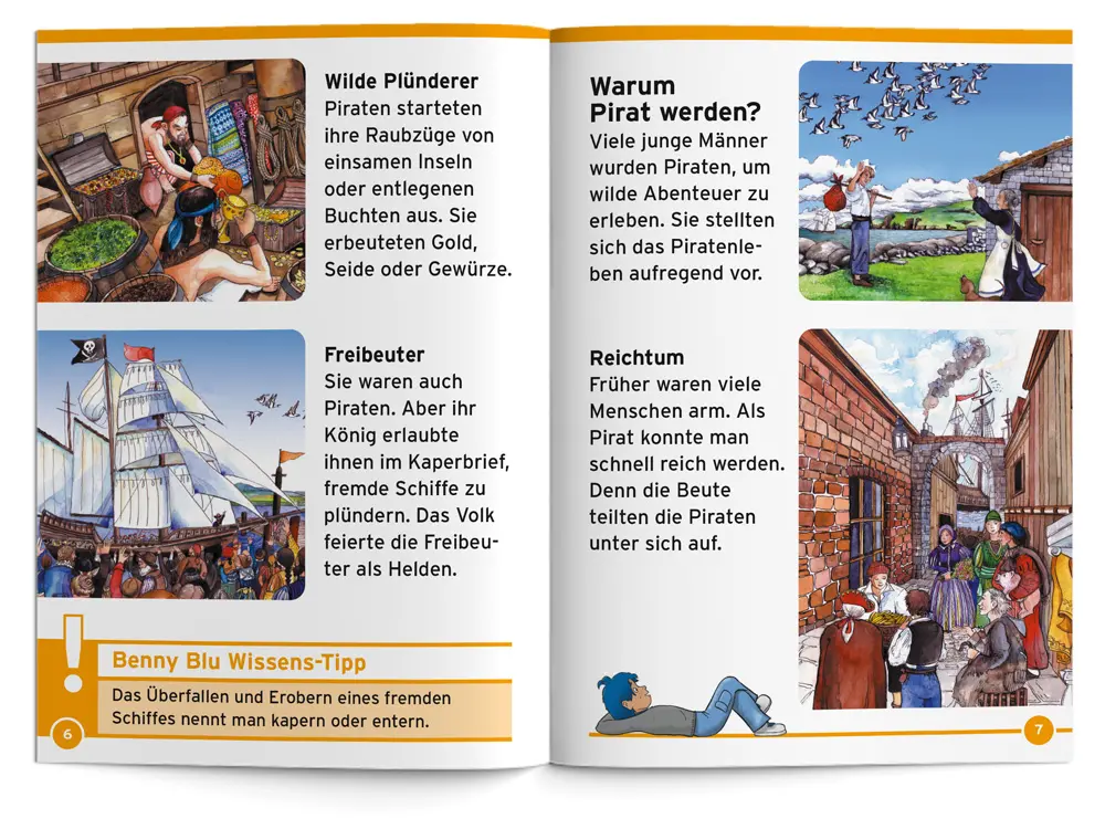 Abenteuer mit den Piraten. Benny Blu begleitet dich in die Welt der wilden Piraten. Wie lebten sie? Wie enterten sie ein Schiff? Wer gehörte zur Besatzung? Und was bedeuteten eigentlich die Flaggenzeichen?
