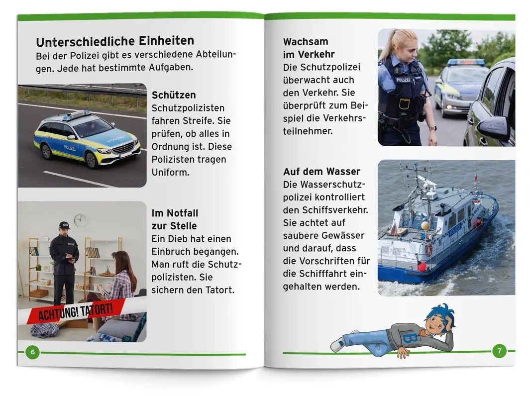Benny Blu besucht mit dir eine Polizeiwache. Welche Aufgaben hat die Polizei? Wie sucht sie Verbrecher? Was gehört zu ihrer Ausrüstung? Und welche Rolle spielen Tiere bei der Polizeiarbeit?