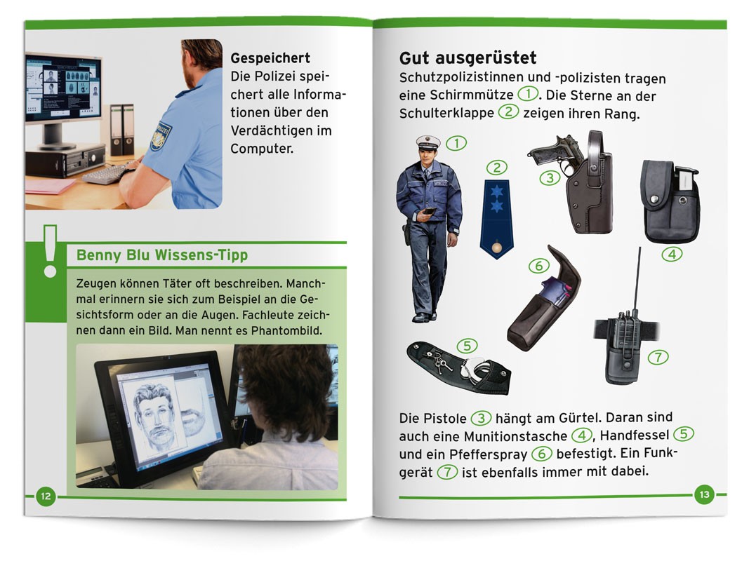 Benny Blu besucht mit dir eine Polizeiwache. Welche Aufgaben hat die Polizei?Wie sucht sie Verbrecher? Was gehört zu ihrer Ausrüstung? Und welche Rolle spielen Tiere bei der Polizeiarbeit?