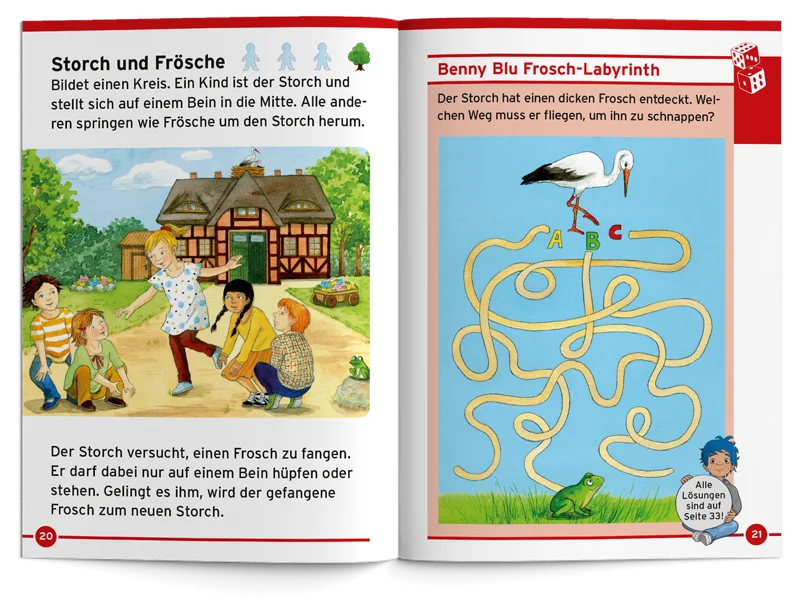 Benny Blu zeigt dir seine Lieblingsspiele für drinnen und draußen. Was ist ein Kugelkar- ton? Wie funktioniert Zapfenhüpfen? Macht alleine spielen auch Spaß? Und was kann man tun, wenn es regnet oder schneit? Mit jeder Menge tollen Spielideen, lustigem Suchbild und spannendem Frosch-Labyrinth.