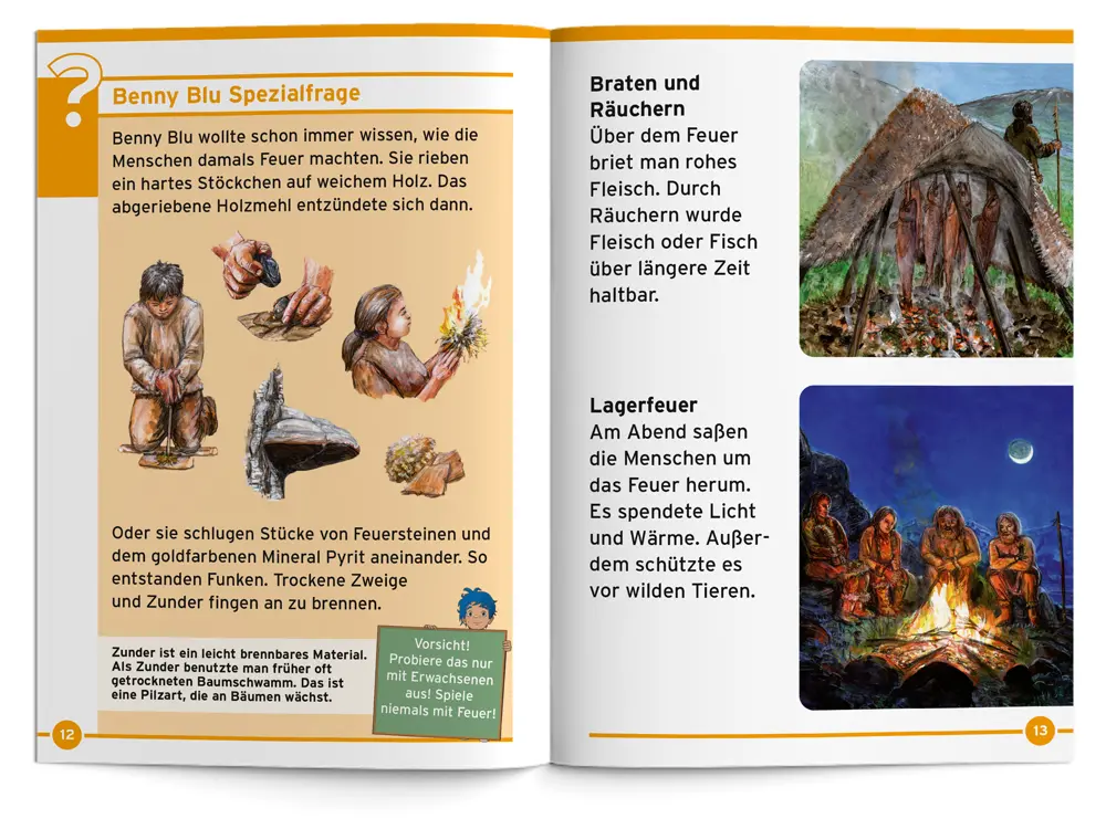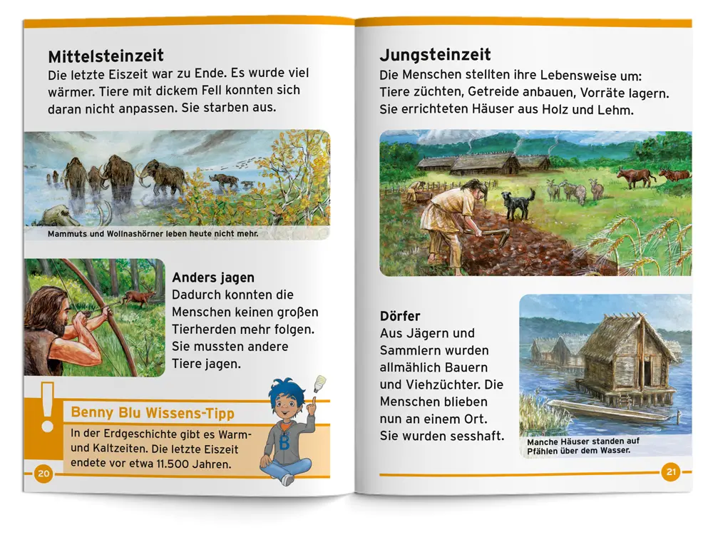 Das Leben unserer Urahnen. Benny Blu begibt sich mit dir auf eine spannende Reise in die Steinzeit. Wie lebten die Menschen damals? Was haben sie gegessen? Gingen die Kinder zur Schule? Und was sind Megalithe?