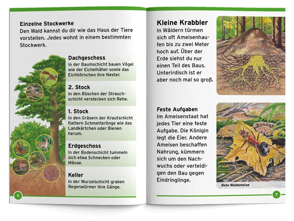 Welche Tiere gibt es im Wald? Wo finden sie ihre Nahrung? Warum sind Wildschwein-Junge gestreift? Warum klopfen Spechte?