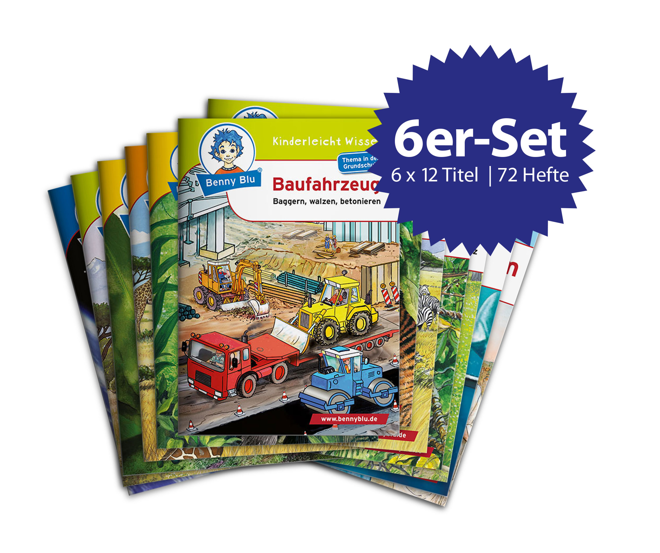 Unsere themenbozogenen Sets richten sich an alle, die nicht genug von den Benny Blu Wissenheften bekommen können. 6 x 12 ausgewählte, kindgerechte Titel laden zum Lesen, Lernen und Staunen ein. Perfekt als Geburtstagsgeschenk oder kleines, sinnvolles Mitbringsel. Falls Sie nur bestimmte Einzelhefte nachbestellen wollen, können Sie das bequem und direkt über die Titelauflistung auf dieser Seite tun.