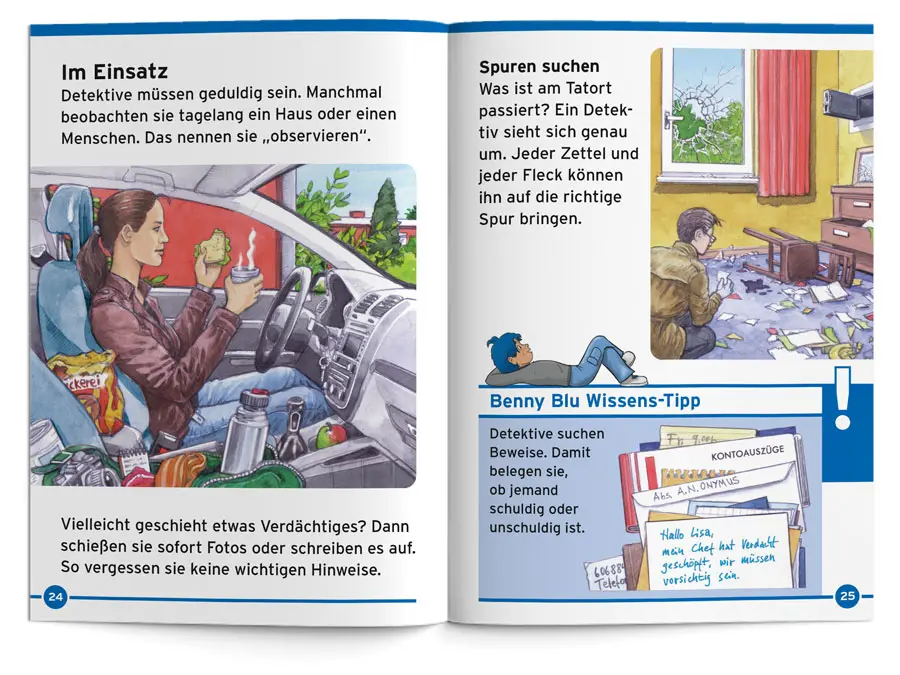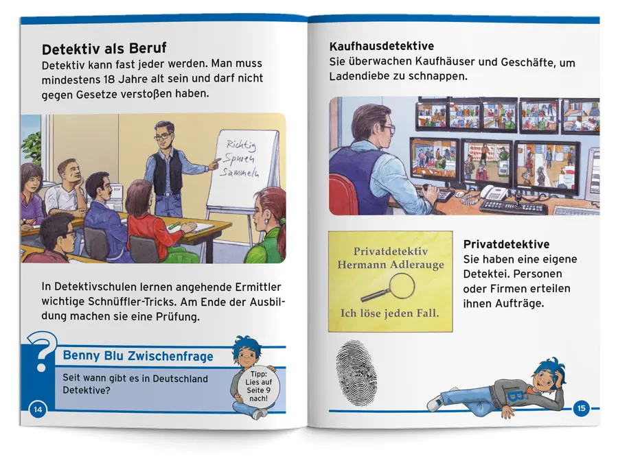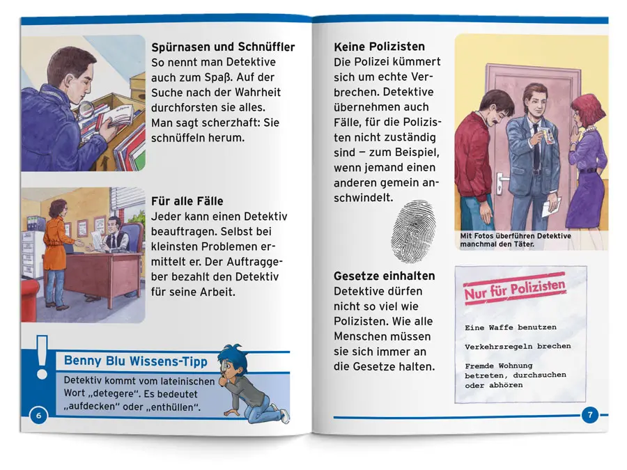 Benny Blu weiht dich in die Geheimnisse der Detektive ein. Was machen Detektive eigentlich genau? Welche Tricks kennen sie? Wie lösen sie ihre Fälle? Und wer ist Sherlock Holmes? Mit cleveren Wissens-Tipps, Benny Blu Detektiv-Rätsel und Spürnasen-Test.