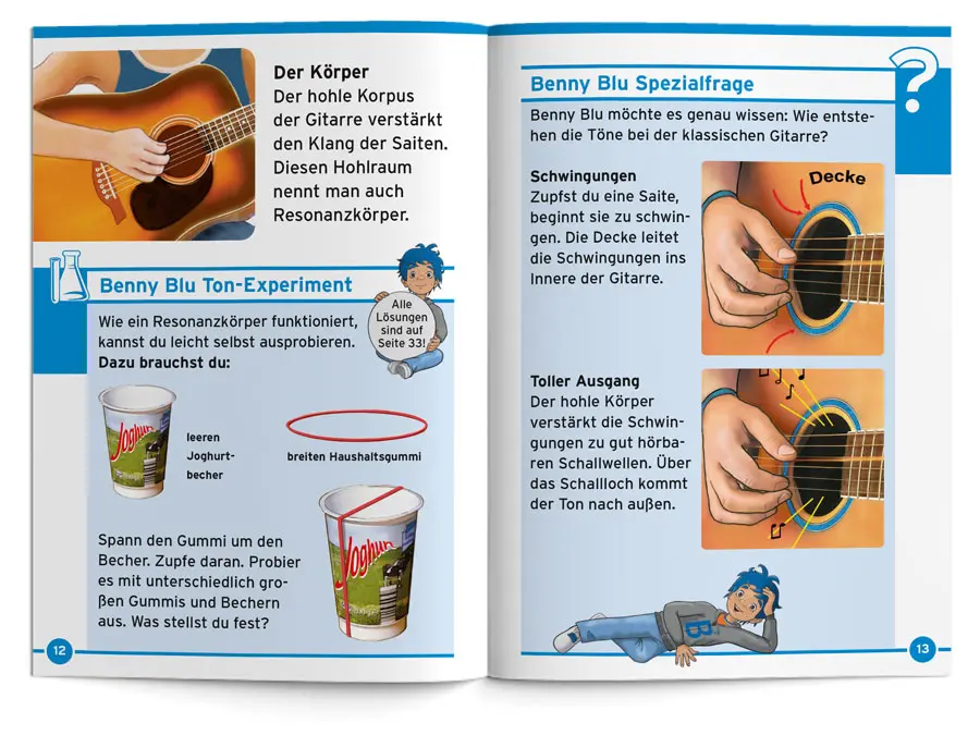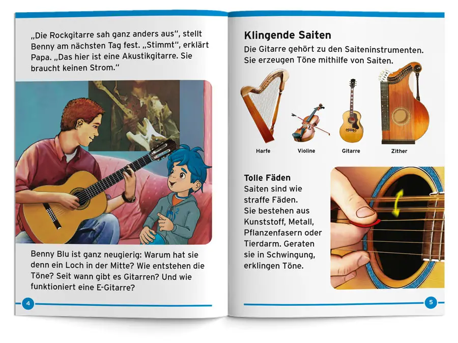Benny Blu entdeckt mit dir die Welt der Gitarren. Wie entstehen die Töne? Was ist eine Akustikgitarre? Warum sind Gitarren innen hohl? Was ist ein Akkord? Und wie funktioniert eine E-Gitarre? Mit vielen Wissens-Tipps, Benny Blu Ton- Experiment und Gitarren-Suchbild.
