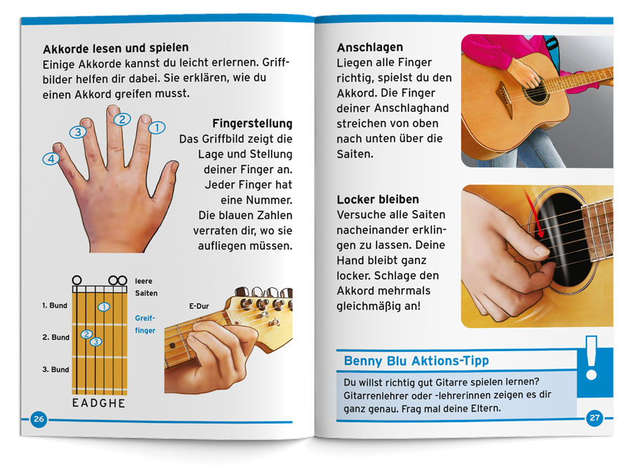 Benny Blu entdeckt mit dir die Welt der Gitarren. Wie entstehen die Töne? Was ist eine Akustikgitarre? Warum sind Gitarren innen hohl? Was ist ein Akkord? Und wie funktioniert eine E-Gitarre? Mit vielen Wissens-Tipps, Benny Blu Ton- Experiment und Gitarren-Suchbild.