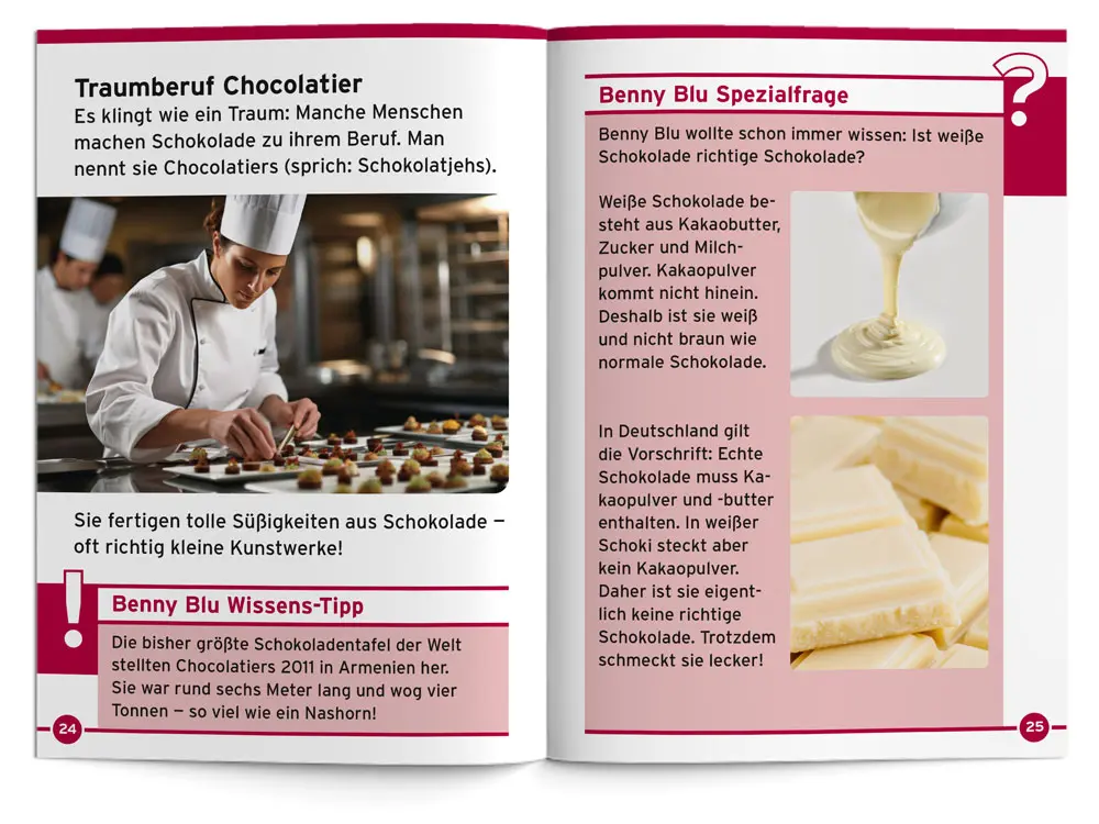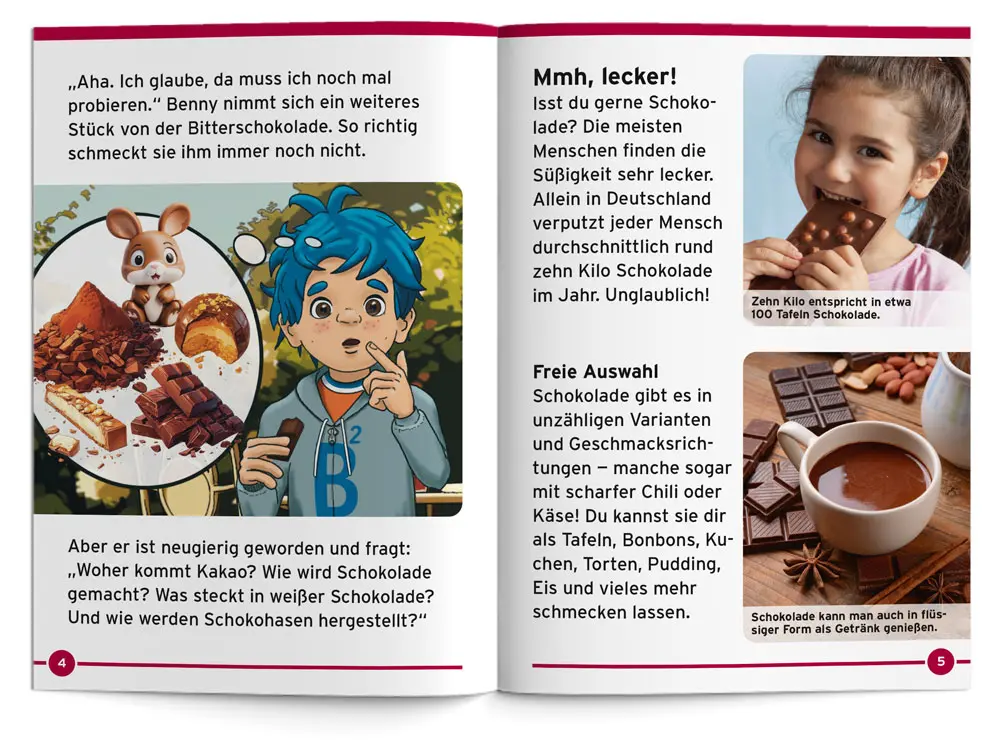 Benny Blu taucht mit dir ein in die süße Welt der Schokolade. Woher kommt der Kakao für die Schokolade? Was passiert in der Schokoladenfabrik? Wieso macht Schokolade glücklich? Und was ist eigentlich faire Schokolade? Mit süßen Wissens-Tipps, Benny Blu Schoki- Rätsel und Rezept „Schoko-Berge“.