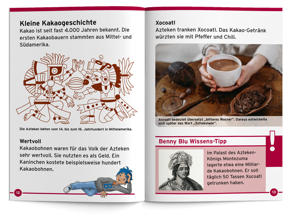 Benny Blu taucht mit dir ein in die süße Welt der Schokolade. Woher kommt der Kakao für die Schokolade? Was passiert in der Schokoladenfabrik? Wieso macht Schokolade glücklich? Und was ist eigentlich faire Schokolade? Mit süßen Wissens-Tipps, Benny Blu Schoki- Rätsel und Rezept „Schoko-Berge“.