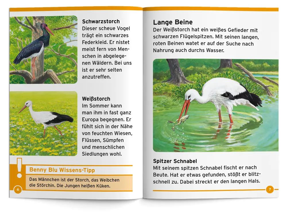 Benny Blu stellt dir die Störche vor. Wo bauen sie ihre Nester? Warum ziehen sie im Winter in den Süden? Wie unterhalten sie sich miteinander? Und bringen die Störche wirklich die Babys?