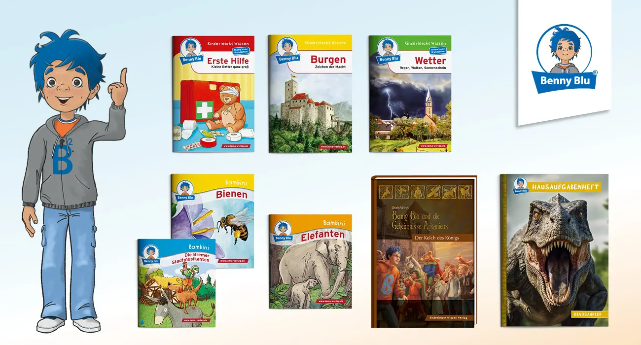 Ergründen, Wissen, Spielen: So lautet das Motto der Benny Blu-Produkte. Stets aufs Neue entdeckt der blauhaarige Schlaukopf Benny Blu spannende Wissensgebiete. Neben pädagogisch wertvollen Wissensbüchern ergänzen altersgerechte Bambini-Kindertitel für Vorschulkinder und tolle Hausaufgabenhefte sowie eine Erstlese- und Romanreihe das Portfolio.