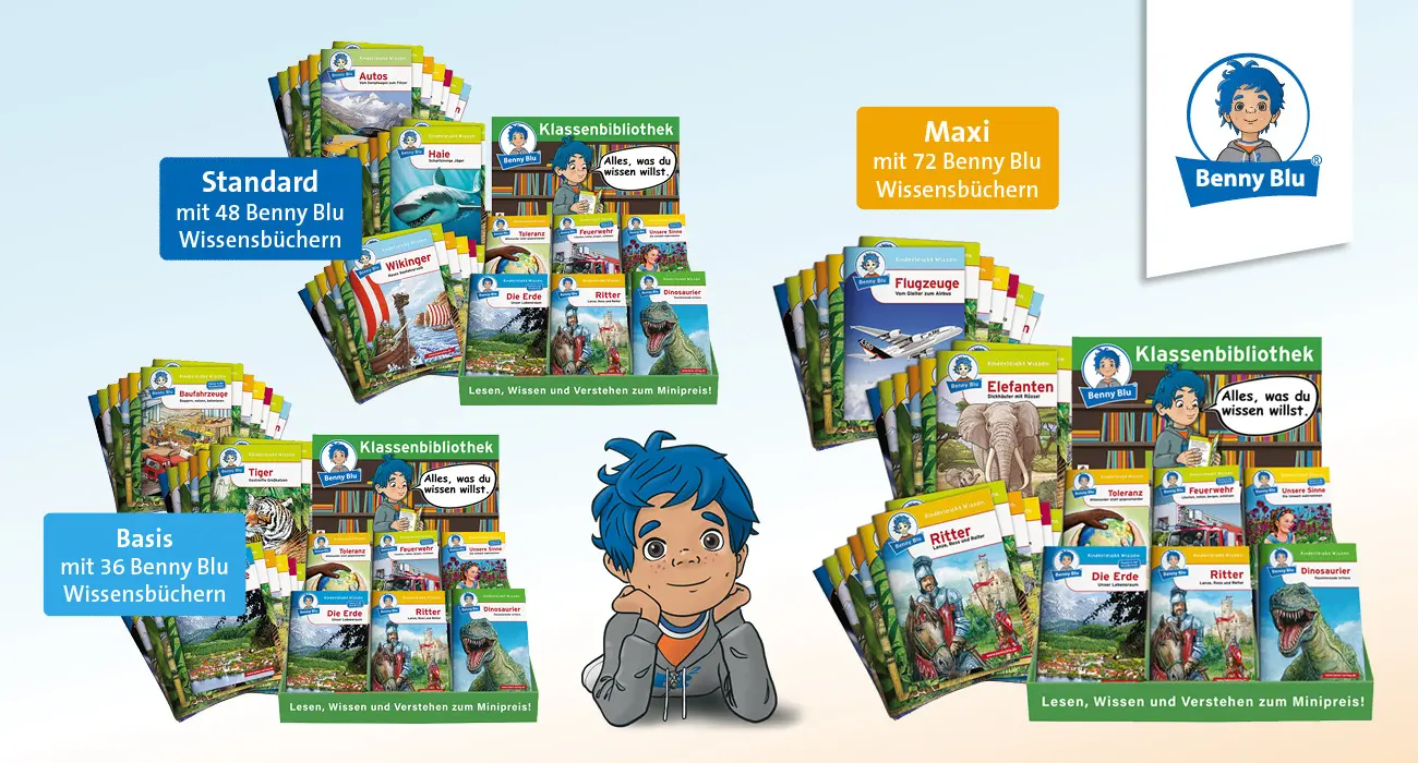 Die Klassenbibliotheken von Benny Blu sind in den drei Größen Basis, Standard und Maxi erhältlich. Jede Klassenbibliothek enthält eine bunte Auswahl der beliebtesten Benny Blu Wissensbücher. In jedem Titel nimmt der pfiffige Schlaukopf mit dem blitzblauen Haar seine LeserInnen mit auf eine Reise in die große Welt des Wissens.