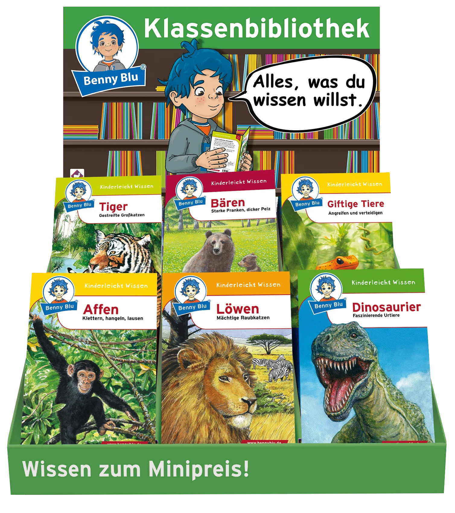 Die Klassenbibliothek Basis besteht aus drei verschiedenen Themensets mit je 12 Benny Blu Titeln und kommt damit auf eine Größe von 36 Wissenstiteln.