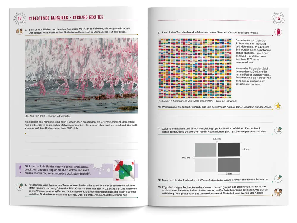 Da der Kunstunterricht an Grundschulen meistens nicht von Fachlehrkräften durchgeführt wird, ist diese Handreichung mit Kopiervorlagen und Lösungen zum Arbeitsheft ein zeitgemäßer, kreativer und perfekter Begleiter für Lehrkäfte. Ohne aufwendige Vorbereitung seitens der Lehrkraft kann damit den SchülerInnen – leicht verständlich und auf abwechslungsreiche Weise – verschiedene Künstler, Kunstepochen und Kunstbereiche vermittelt werden.
