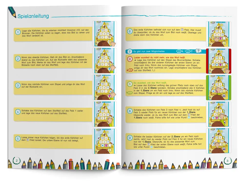 • Wenn die Schüler/-innen das passende Wort korrekt nennen oder schreiben können, wandert das Kärtchen eine Ebene nach oben.