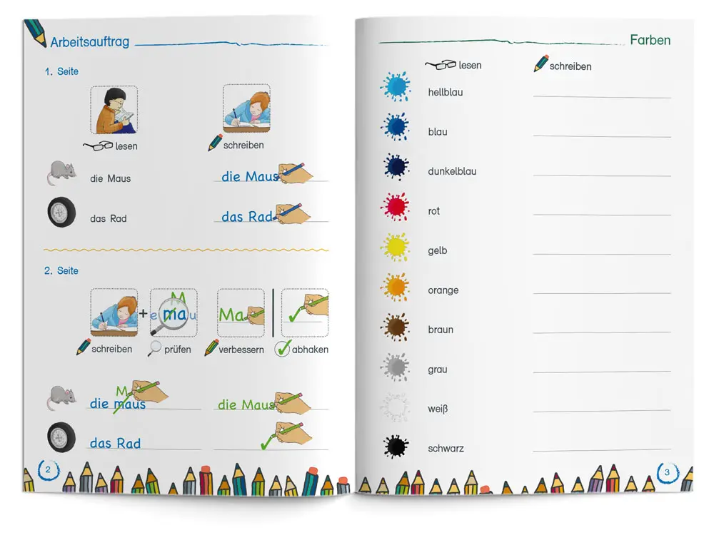 - Die Schüler/-innen beginnen auf der ersten Doppelseite und schreiben das Wort fehlerfrei ab.