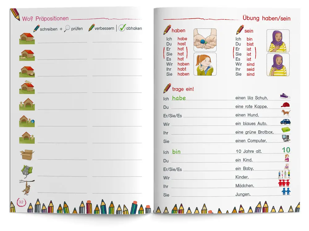 Mit dem Vokabelheft können die Schüler/-innen den erlernten Wortschatz aus den Kapiteln des Arbeitshefts nochmals strukturiert trainieren und ihre Lernfortschritte selbst kontrollieren. Dabei üben sie sowohl das Lesen als auch das Schreiben der Wörter.