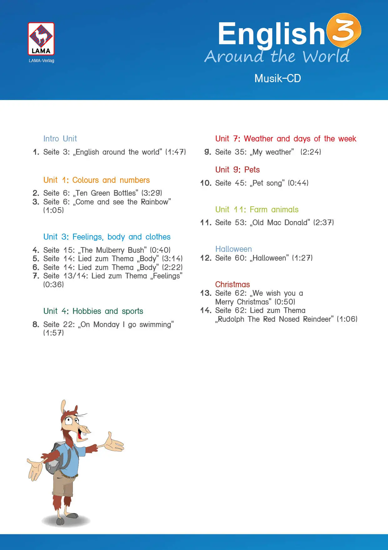 Passend zum Arbeitsheft Englisch Around the World 3 wird der Englischunterricht mit dieser Musik-CD abwechslungsreich und unterhaltsam. Gleichzeitig wird das neu Erlernte durch die einprägsamen Lieder gefestigt und wie ein Ohrwurm im Gedächtnis verankert.