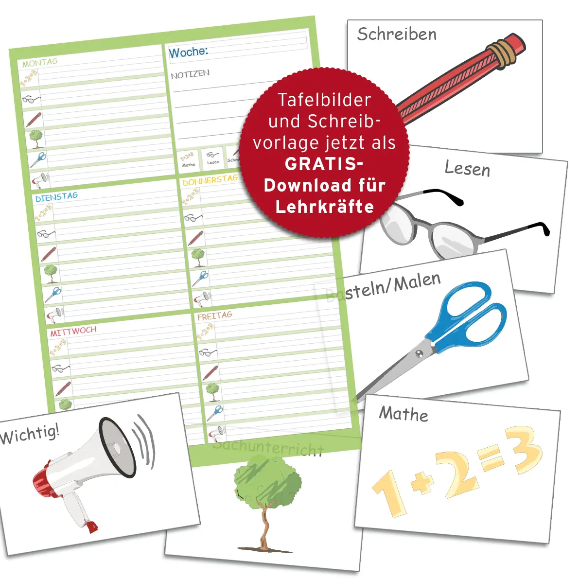 Passend zum Heft gibt es die Tafelbilder und Wochenübersicht im DIN A4 Format als Gratis-Download für Lehrkräfte.