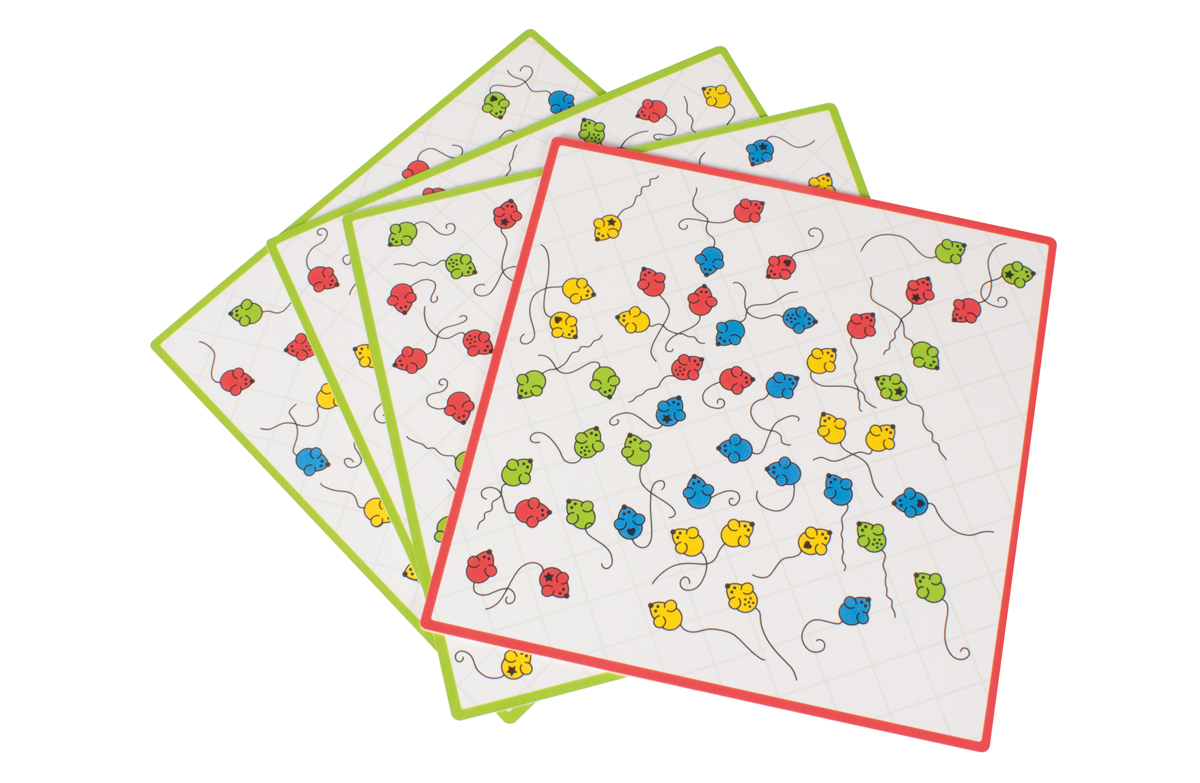 Alarm auf Schloss Käseburg - Suchspiel. Die Mäuse sind los, denn überall auf Schloss Käseburg liegt Käse herum. Jedes Kind erhält eine Käseschablone mit drei Löchern, um die hungrigen Tierchen wieder einzufangen. Dazu wird eine der Käsekarten aufgedeckt, dann schieben alle ihren Holzkäse über den Spielplan und versuchen, die drei auf der Käsekarte abgebildeten Mäuse genau so auf ihrem Spielbrett zu finden. So wird bei den Kindern vor allem die optische Wahrnehmung und die Konzentrationsfähigkeit geschult. Lustiges Käse-Maus-Spiel, schwierigere Version auf der Rückseite des Spielplans.