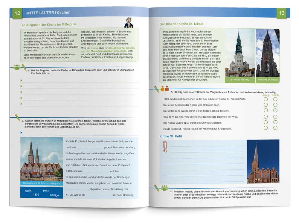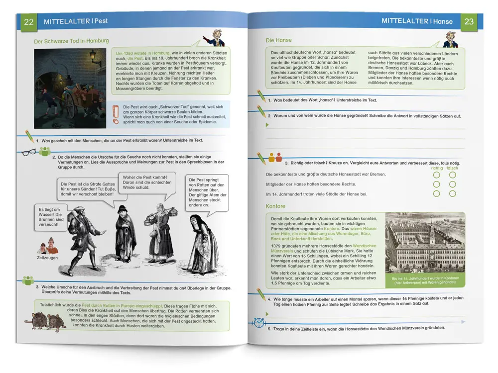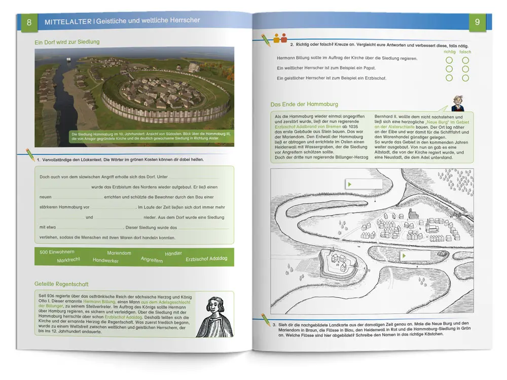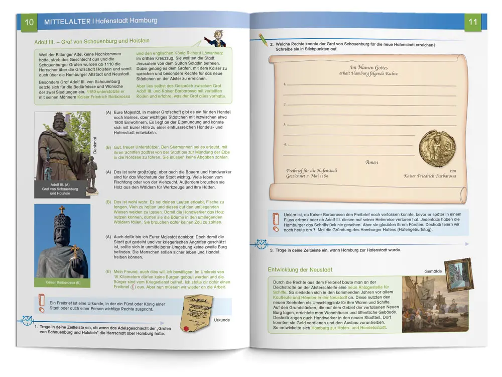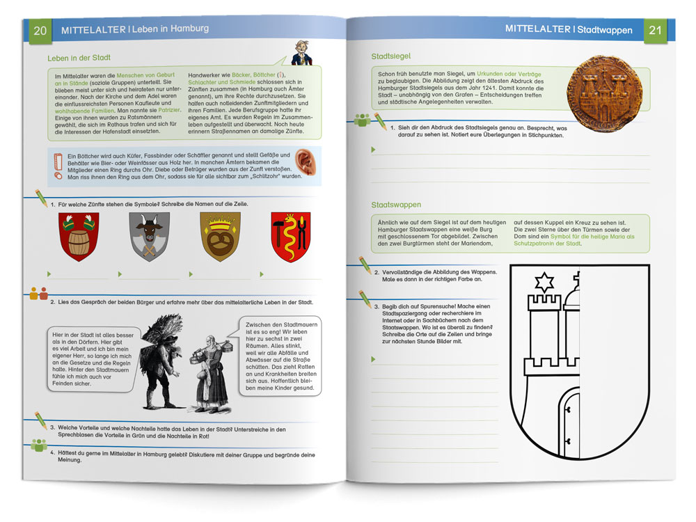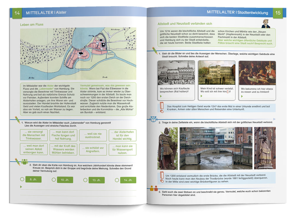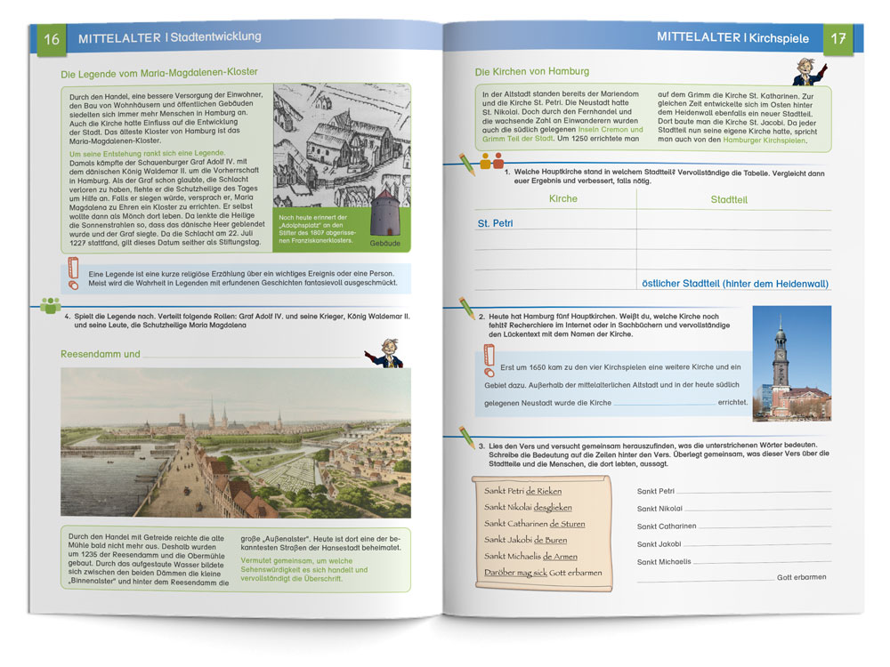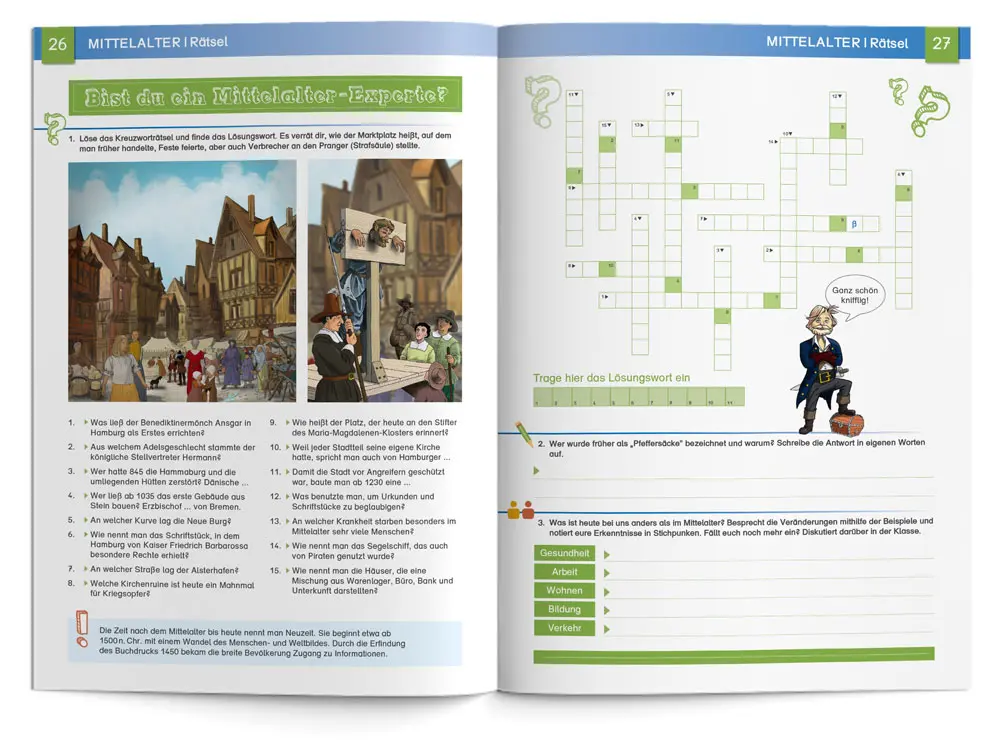 Mittelalter – geistliche und weltliche Herrscher, Hafenstadt Hamburg, Kirchen, Alster, Stadtentwicklung, Kirchspiele, Stadtmauer, Leben in Hamburg, Stadtwappen, Pest, Hanse, Klaus Störtebeker, Rätsel
