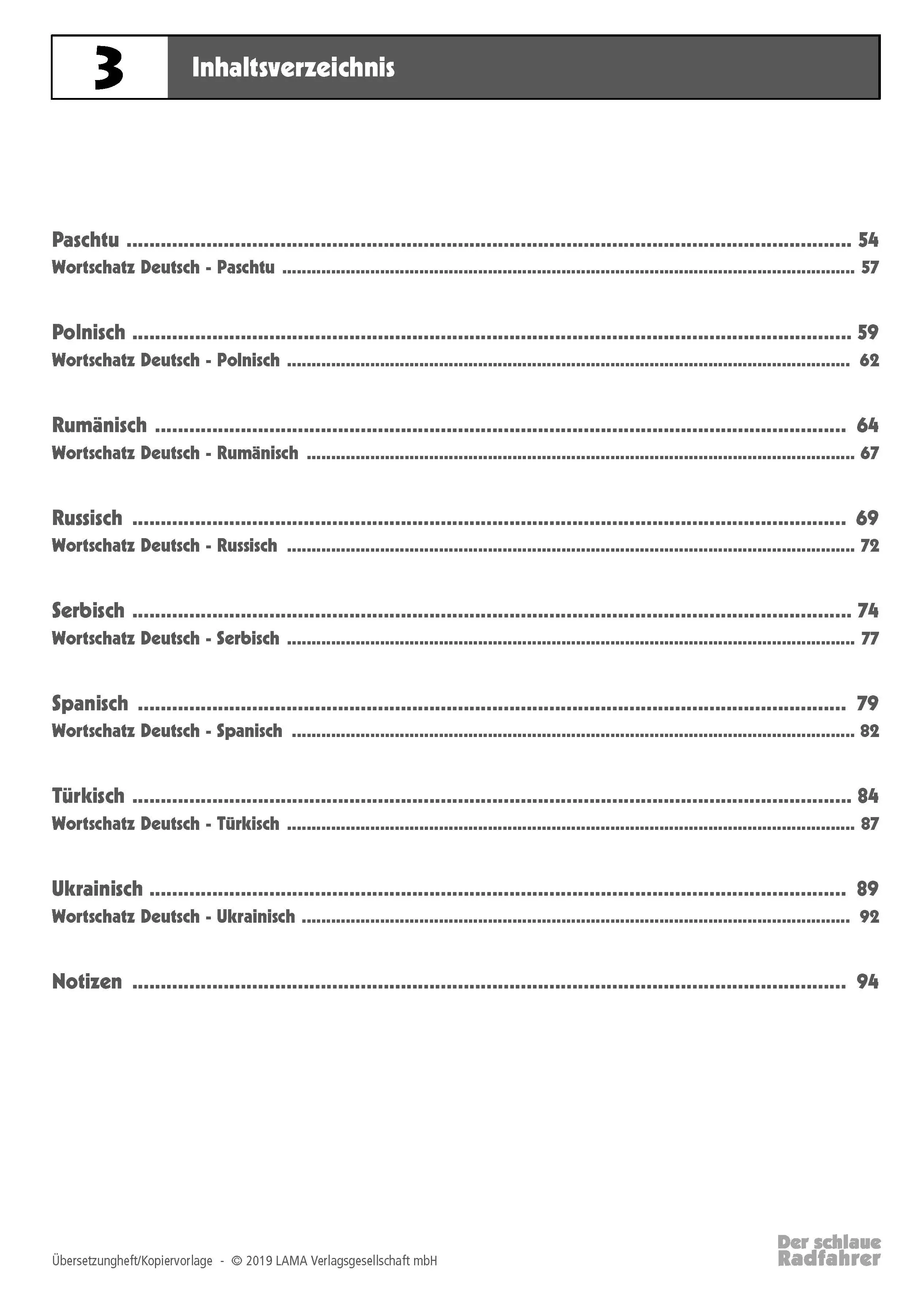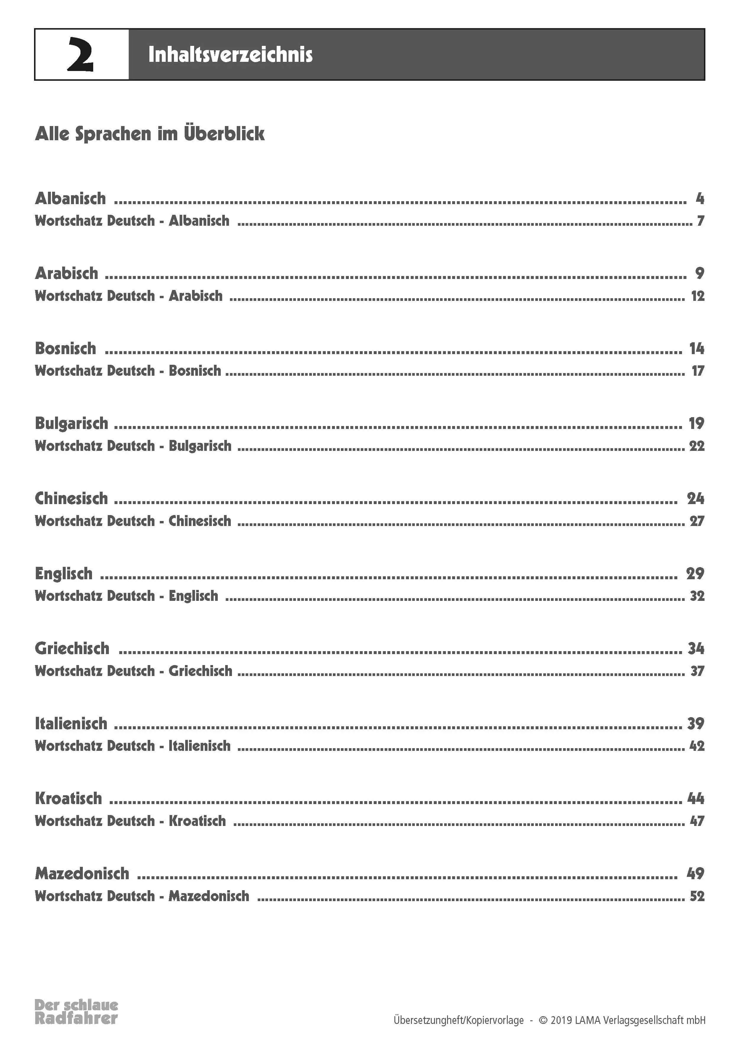 In der heutigen Zeit nehmen viele Kinder anderer Nationalitäten am Unterricht teil. Sie sind sicherlich ebenso schlaue Radfahrer wie die heimischen Kinder, haben aber oft Schwierigkeiten mit der deutschen Sprache. Aus diesem Grund bieten wir für unser Arbeitsheft „Der schlaue Radfahrer“ ein Nachschlagewerk an, das alle Fachbegriffe und Aufgabenstellungen in 18 verschiedenen Sprachen beinhaltet. Damit vereinfachen Lehrkräfte Kindern mit Migrationshintergrund den Einstieg in das Thema Verkehrserziehung und sparen wertvolle Unterrichtszeit. Alle Blätter dienen als Kopiervorlage und können demnach beliebig vervielfältigt werden.