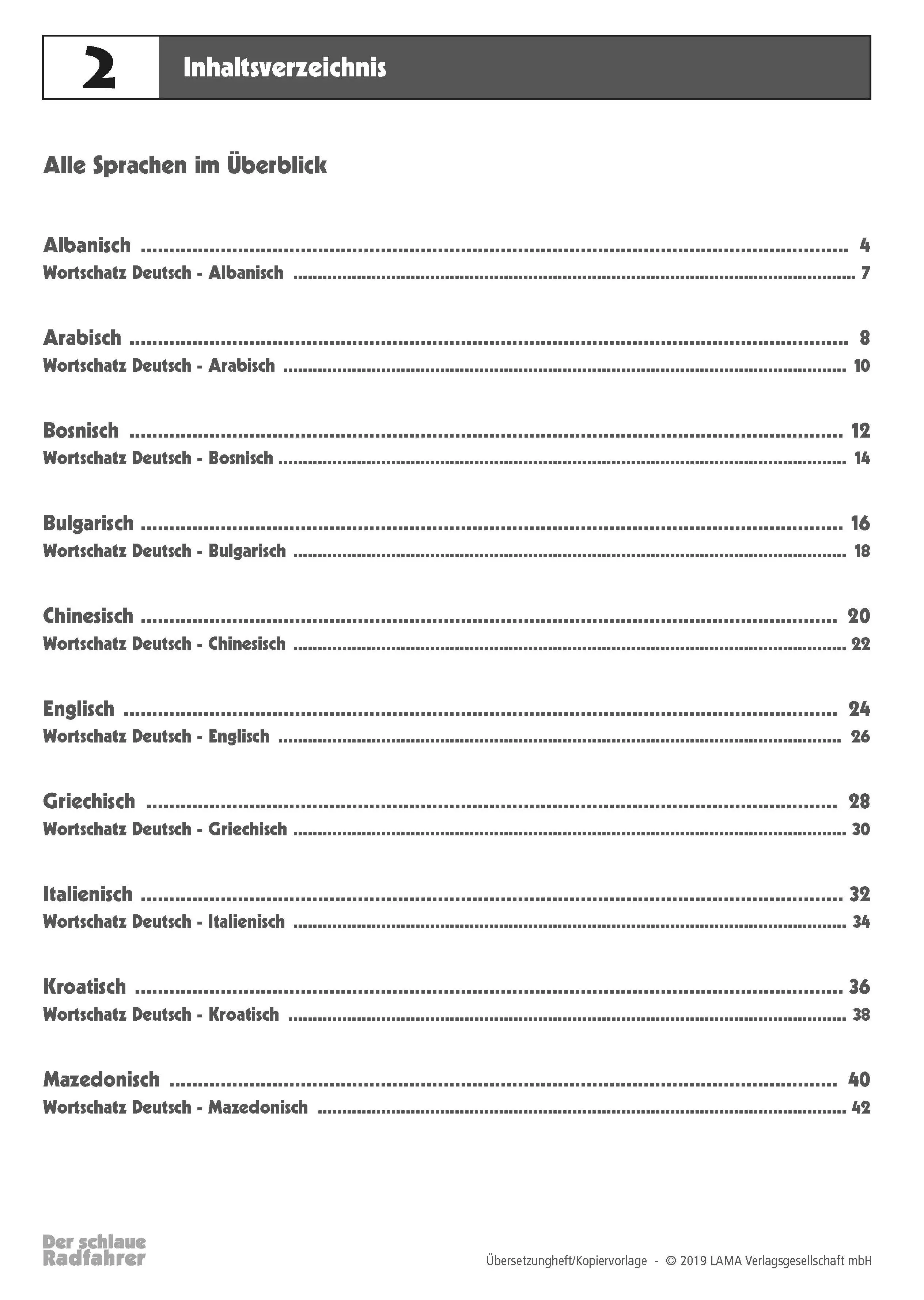 In der heutigen Zeit nehmen viele Kinder anderer Nationalitäten am Unterricht teil. Sie sind sicherlich ebenso schlaue Radfahrer wie die heimischen Kinder, haben aber oft Schwierigkeiten mit der deutschen Sprache. Aus diesem Grund bieten wir für unser Arbeitsheft „Der schlaue Radfahrer" ein Nachschlagewerk an, das alle Fachbegriffe und Aufgabenstellungen in 18 verschiedenen Sprachen beinhaltet. Damit vereinfachen Lehrkräfte Kindern mit Migrationshintergrund den Einstieg in das Thema Verkehrserziehung und sparen wertvolle Unterrichtszeit. Alle Blätter dienen als Kopiervorlage und können demnach beliebig vervielfältigt werden.