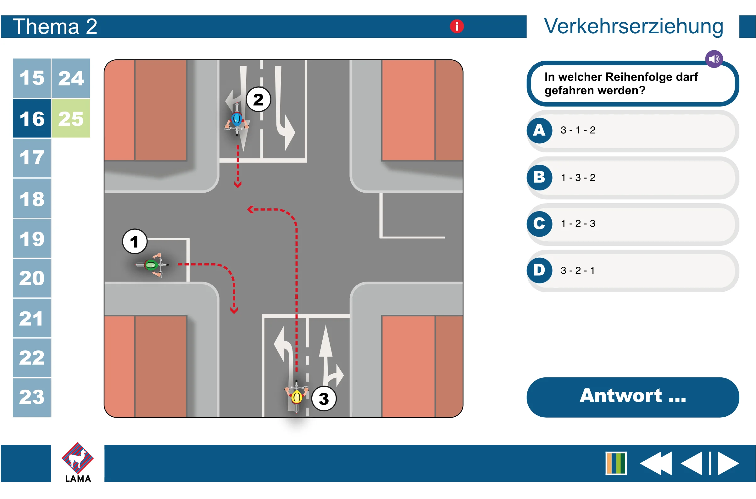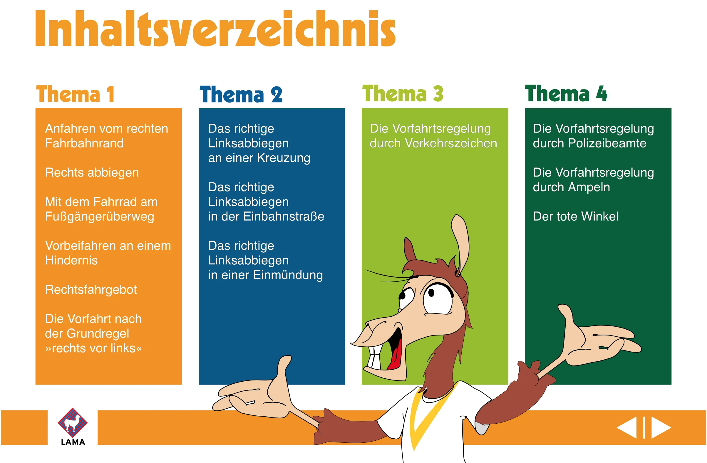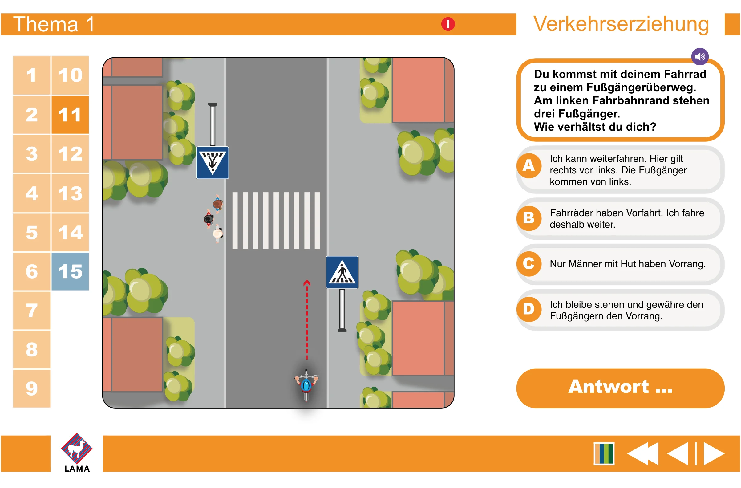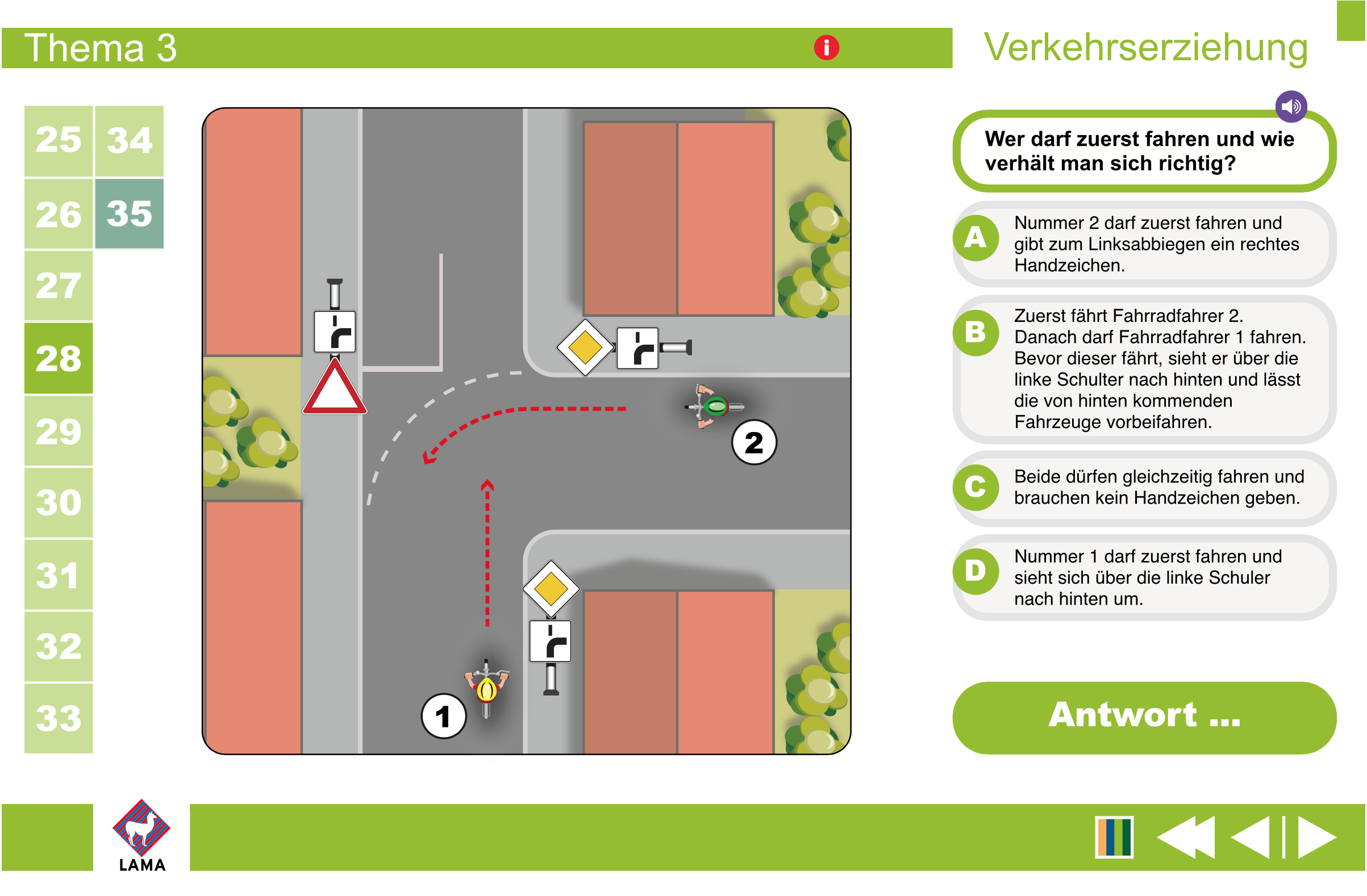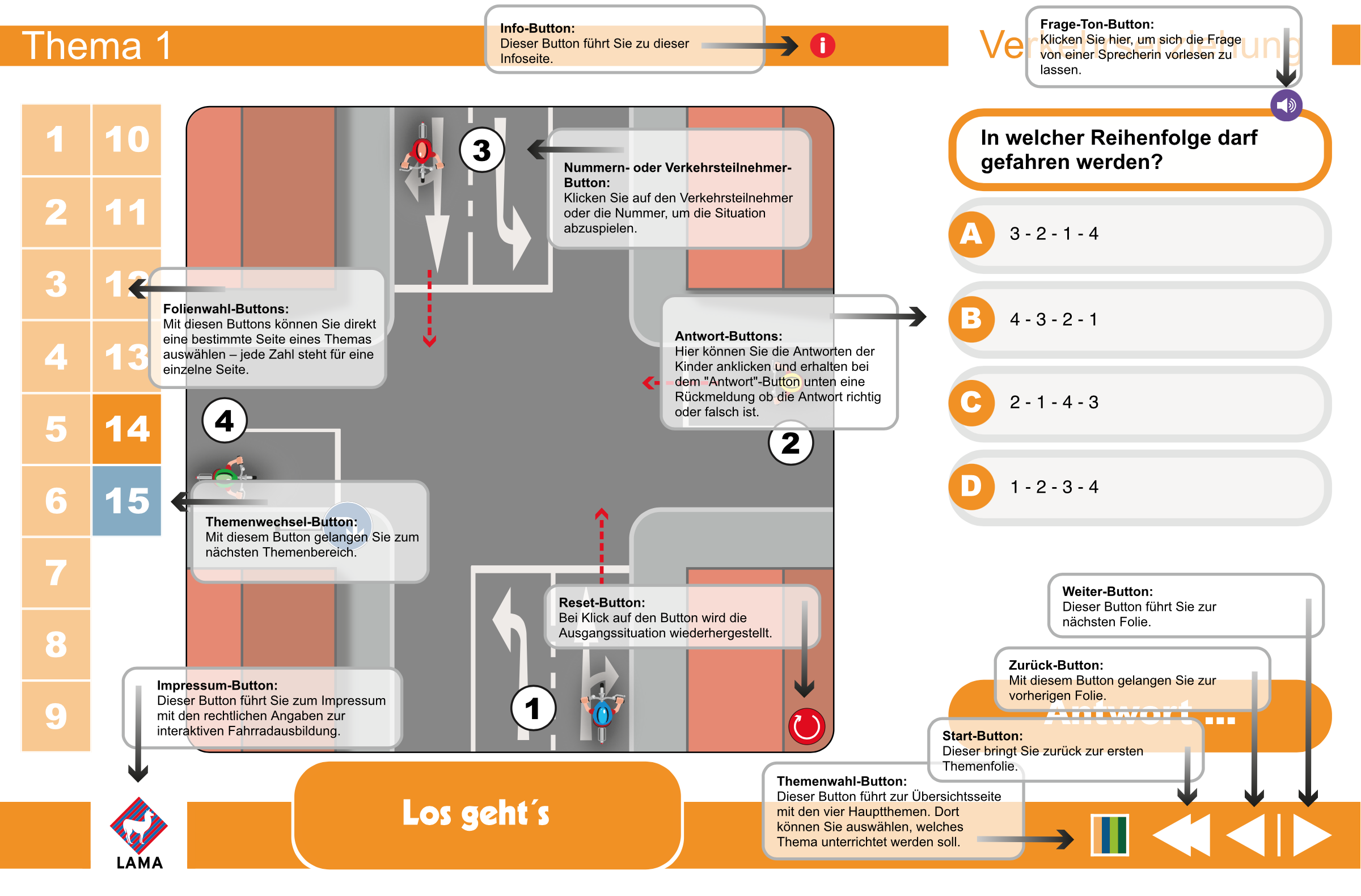 Schüler/-innen der 4. Klasse werden diese digitale und gleichzeitig spielerische Art der Verkehrserziehung lieben! Die erste Übungseinheit beginnt, sobald die Flash-Datei vom USB-Stick gestartet wurde. Die Spielkarte am rechten Rand zeigt die Frage und die möglichen Antworten. Sobald sich die Klasse auf eine Antwort geeinigt hat, wird die Animation durch Anklicken des gewählten Verkehrsteilnehmers gestartet. Wenn es jetzt knallt und zum Unfall kommt, war die Antwort falsch. Über den Repeat-Button kann die Übungseinheit wiederholt werden und wird dann hoffentlich richtig gelöst. Auf diese anschauliche und einprägsame Weise lernen die Kinder schnell, wie sie sich als Radfahrer schlau verhalten und werden optimal auf die Fahrradprüfung vorbereitet.