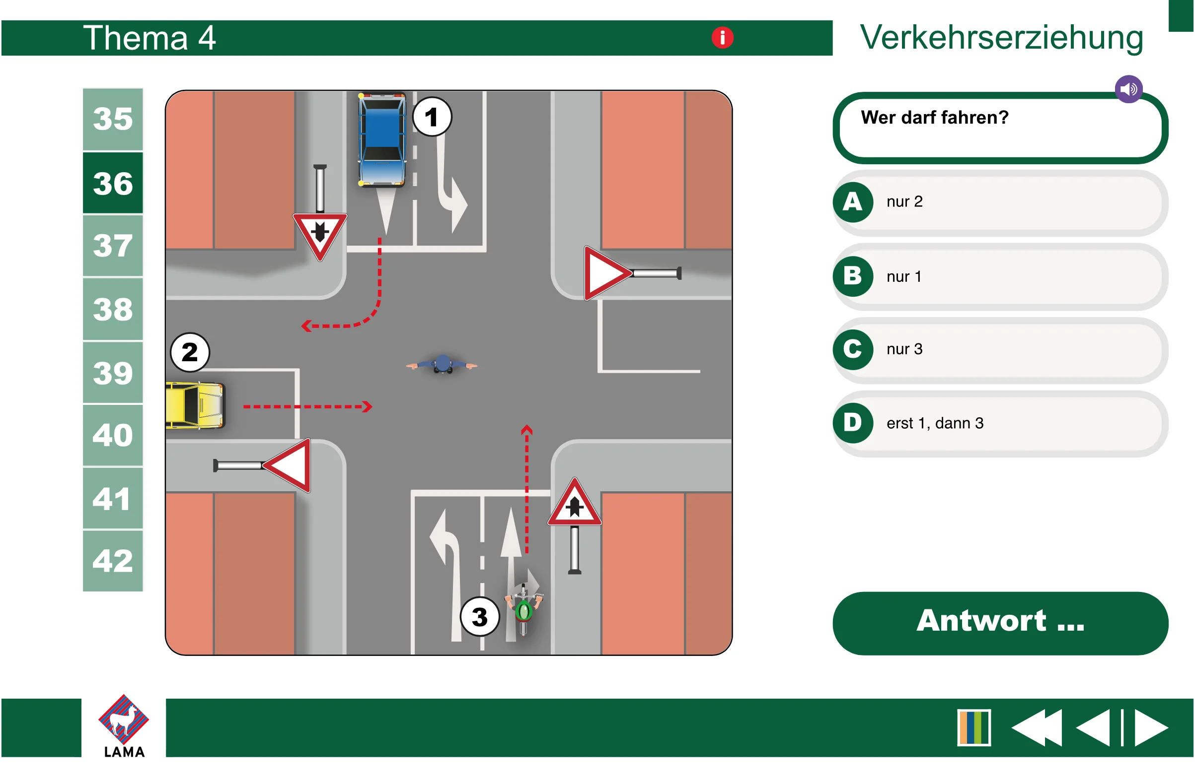 - Vorfahrtregelung durch Ampeln und Polizeibeamte, toter Winkel - direkte Rückmeldung durch Animation der Verkehrsteilnehmer