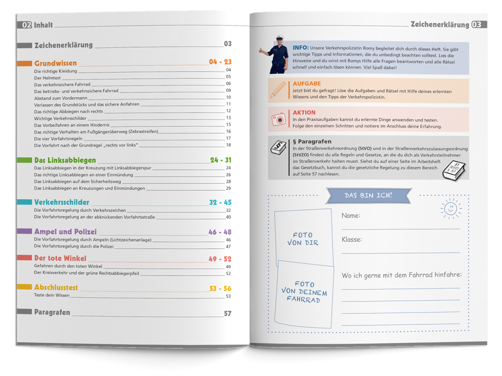 Dieses Selbst erklärende Arbeitsheft zur Vorbereitung auf die Fahrradausbildung kann sowohl fürs Homeschooling als auch in der Schule verwendet werden. Alle Inhalte sind so aufbereitet, dass ein selbstständiges Lernen ermöglicht wird und die Aufgaben mithilfe des Lösungshefts durch Eltern oder Lehrkraft überprüft werden können.