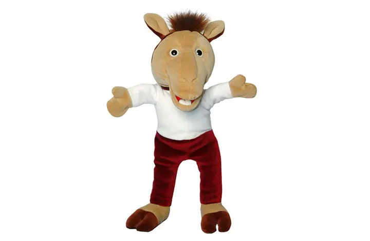Unser kleines Lama ist 40 cm groß und kann mit einer Hand gespielt werden. Der bewegliche Mund macht den Kleinen lebendig und lässt ihn „große Töne spucken“.